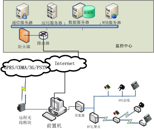 環(huán)境監(jiān)測報警系統(tǒng)通過采集現(xiàn)場傳感器數(shù)據(jù),并將數(shù)據(jù)通過有線、無線方式實時傳輸?shù)焦ぷ髡旧线M行監(jiān)測、存儲與分析,輸出曲線與多類圖表,進行統(tǒng)計分析和檔案記錄;系統(tǒng)提供手機、短信和郵件多種遠程報警功能,供事后分析處理;可根據(jù)用戶應用靈活配置各類環(huán)境因子傳感器;系統(tǒng)具有分級和角色權限管理功能,為不同用戶管理提供了一個多級配置管理的監(jiān)控平臺,為現(xiàn)場管理和質量控制提供強有力的技術保障。系統(tǒng)結構如下圖: