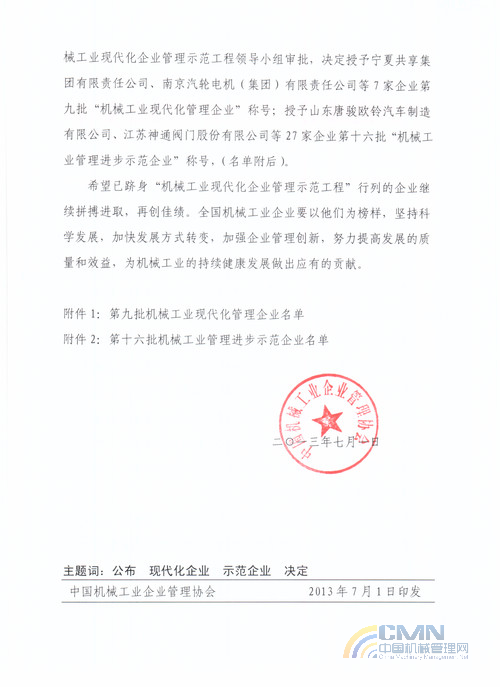關(guān)于公布第九批機(jī)械工業(yè)現(xiàn)代化管理企業(yè)與第十六批管理進(jìn)步示范企業(yè)的決定