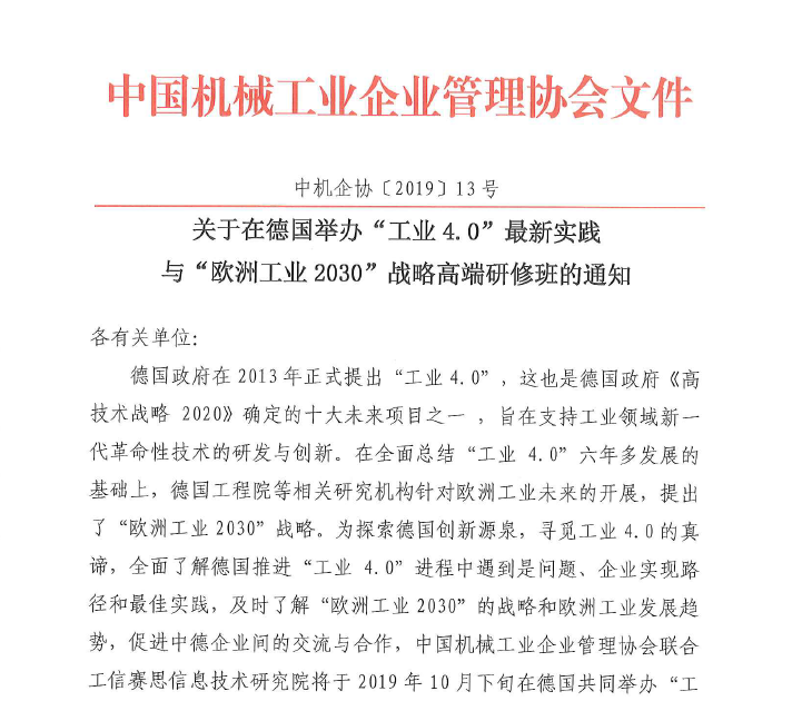 關(guān)于在德國舉辦“工業(yè)4.0”最新實踐與“歐洲工業(yè)2030”戰(zhàn)略高端研修班的通知-中機企協(xié)〔2019〕13號.pdf