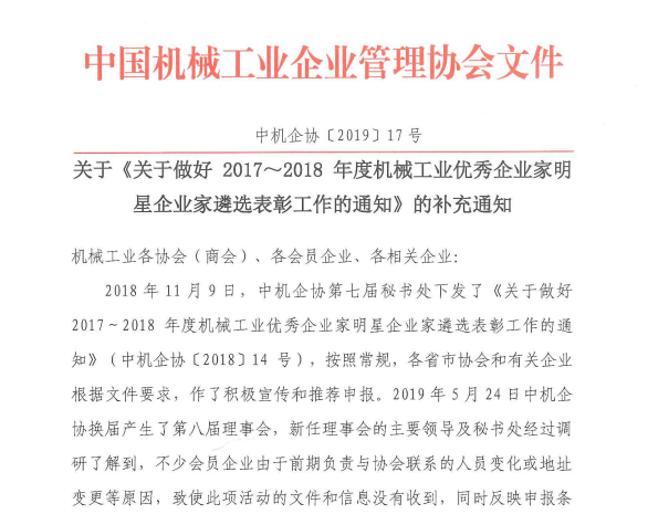 關(guān)于做好2017~2018年度機(jī)械工業(yè)優(yōu)秀企業(yè)家明星企業(yè)家遴選表彰工作的補(bǔ)充通知--中機(jī)企協(xié)[2019]17號(hào).pdf
