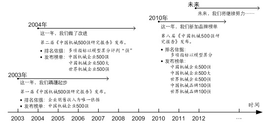 2003年,首屆《500強(qiáng)報(bào)告》發(fā)布首份“中國(guó)機(jī)械企業(yè)500強(qiáng)”榜單,企業(yè)營(yíng)業(yè)收入是入圍榜單排名的唯一依據(jù)。2004年,第二屆《500強(qiáng)報(bào)告》對(duì)榜單做了重大改進(jìn),在“中國(guó)機(jī)械500強(qiáng)”榜單基礎(chǔ)上新增“中國(guó)機(jī)械500大”榜單,并嘗試發(fā)布“世界機(jī)械500強(qiáng)”榜單。企業(yè)收入是入圍“500大”榜單的依據(jù),對(duì)于“強(qiáng)”的判斷則引入“規(guī)模”和“效率”雙重含義,采用世界企業(yè)實(shí)驗(yàn)室(World Company Lab)按國(guó)際慣例設(shè)計(jì)的企業(yè)競(jìng)爭(zhēng)力評(píng)測(cè)模型(CVA)對(duì)企業(yè)的銷(xiāo)售收入、利潤(rùn)總額、資產(chǎn)利潤(rùn)率、增長(zhǎng)率等數(shù)據(jù),結(jié)合行業(yè)差異、聲望指數(shù)等因素進(jìn)行綜合分析研究,按得分方式為“500強(qiáng)”排序。2010年,第八屆《500強(qiáng)報(bào)告》除了延續(xù)七年的3個(gè)榜單外,品牌成為500強(qiáng)研究的重要延伸,報(bào)告新增發(fā)布了“中國(guó)機(jī)械品牌100強(qiáng)”和“世界機(jī)械品牌100強(qiáng)”榜單。