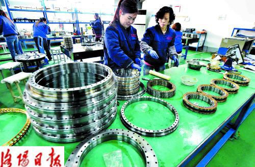 ?。保慈?,在洛陽鴻元軸承科技有限公司,工作人員正在檢驗(yàn)一批剛下線的精密軸承,準(zhǔn)備發(fā)往外地。